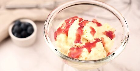 Drizzle it over puddings, custards, fresh fruit, or ice cream. Heat 1/4 cup of storebought or homemade caramel sauce on high heat. Then, stir in ⁄2 cup (120 ml) of hot açaí juice into the caramel and stir really well. Turn off the burner and stir in a small squeeze of lemon. Want to make your own quick caramel? Put 1/4 cup (50 g) of sugar into a small pot along with 3 tablespoons (44 ml) of water and turn the burner to high. Cook the caramel without stirring it until it's light brown.