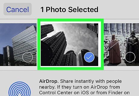Tap the Share button. This is the square icon with an upward-pointing arrow in the bottom-left corner of your screen. If you're sharing a note, voice memo, contact or anything else that's not a photo or image file, look for the same Share button on your screen. If you can't see it anywhere, there will likely be another button that says Share on it.