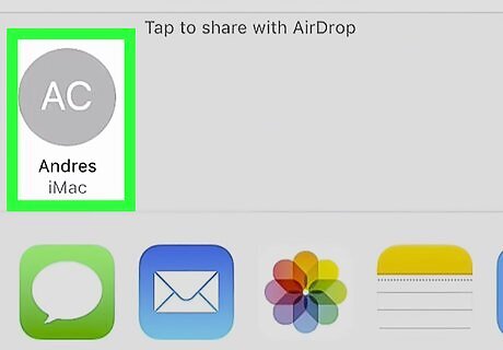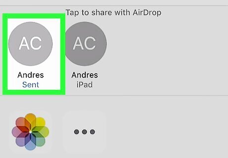 Tap on the name of the person you want to share your file with. You will see a list of all Airdrop-enabled devices in the center of your screen under the heading Tap to share with Airdrop. This section will show you the name and the device information of every discovered contact around you. If Bluetooth and/or AirDrop is not enabled on the receiving device, you will not see your contact here.