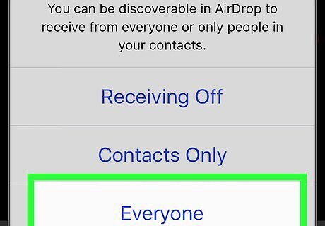 Select Everyone. This option will let anybody with AirDrop to share files with you over Bluetooth. If the person you'll be receiving files from is in your contacts, you can select Contacts Only.