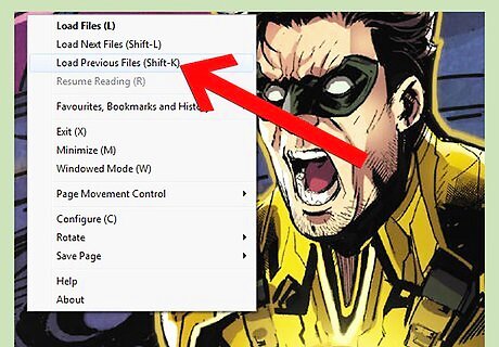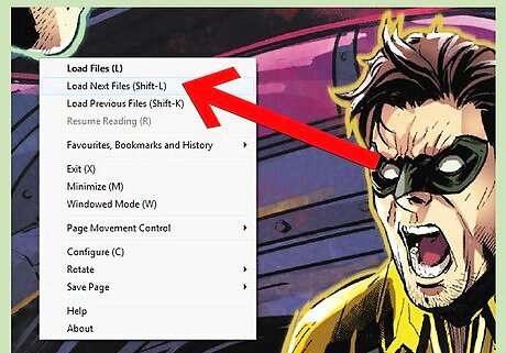 Load comics in a series. If you’re reading a set or collection of comic books in sequence, you don’t need to stop and look for the next file to load. As long as the comic book files are in sequence and located under the same folder, you can navigate through them without leaving your reading screen. Select “File” from the file menu and click on “Load Next Files.” You can also right-click anywhere on the application’s user interface and click on “Load Next Files.” This will load the next comic book in sequence from the same folder.