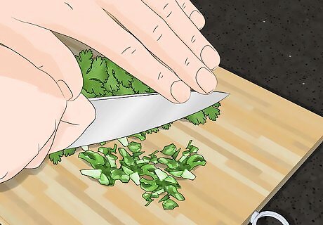 Chop the cilantro. Bunch the cilantro leaves into a pile. Securely hold a chef's knife by the handle. Place the knife blade-side down on top of the cilantro. Place the palm of your other hand on top of the metal part of the knife. Make sure the tips of your fingers are away from the blade. Rock the knife back and forth to roughly chop the leaves. Avoid over cutting the cilantro into small pieces since over cutting can lead to blackened leaves.