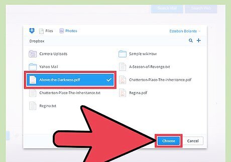 Attach a file from Dropbox. In the compose email window, click on the clip icon for the attachment Options. Choose Share from Dropbox. A dialog window should appear that contains your Dropbox folders. Navigate through your folders and locate the file you’d like to attach. You can attach multiple files at once by selecting them. The files will be highlighted or marked once selected. You can attach files of multiple formats as well. Songs, PDFs, movies, etc.