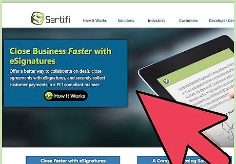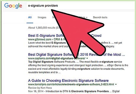 Search for e-signature providers. There are dozens of online services which provide e-signature platforms. To find them, you should search the Internet for “electronic signature provider.” Some of the more popular e-signature providers include: Sertifi RightSignature eSignly DocuSign Signix FilesDNA Hellosign Eversign SignRequest pdfFiller by airSlate Adobe Sign PandaDoc Proposify Lightico Signeasy eSign Genie CocoSign OneSpan Sign