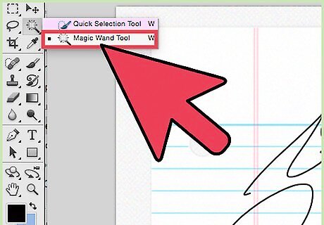 Use the “magic wand” tool. You can find the magic wand tool by clicking on the “Quick Selection Tool” icon in CS3 or later versions of Photoshop. You will use this tool to select your signature. Hover your cursor over the signature and make sure to click on the signature itself. The wand should then select all of the pixels in your signature. Click on “Select” and “Inverse.”