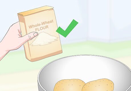 Choose whole-wheat flour or grains when you cook. Breads, pastas, and rices all have whole-wheat options available, and they can usually be found at your local grocery store. These options contain more fiber and they take longer to digest, so they keep you full for longer. Check out other healthy grain substitutes like quinoa, couscous, and barley. These options generally have more fiber, fewer calories, and are denser grains which means you’ll be fuller for longer. If you are gluten free, try cauliflower rice or making “pasta” out of spiralized veggies.