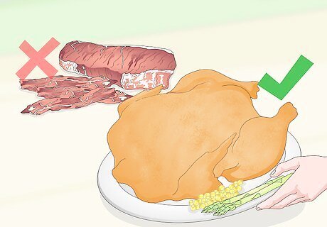 Trade your bacon and red meats for turkey for a low-fat substitute. Turkey bacon and ground turkey are great low-fat substitutes to use in place of other meats! Look for ground turkey that has a 90/10 ratio and use it to make burgers, meatballs, chilis, and other dishes that usually call for ground beef. While turkey and ground beef have about the same calories and protein, turkey contains fewer unhealthy fats.