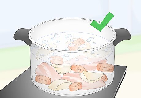 Boil your veggies and meats to cook them without using any oils or fats. All you need to boil food is a large pot, water, and a little bit of salt. Carrots, broccoli, cauliflower, potatoes, chicken, and beef are just a few options for ingredients you can boil. Check online for specific boiling times. Vegetables like carrots and broccoli generally take about 8-10 minutes to boil, whereas potatoes will take a little bit longer, about 15 minutes. Use a meat thermometer to check the interior temperature of meats to make sure they’re cooked all the way through. Once you think the meat should be done, remove it from the hot water with tongs and place it on a cutting board. Insert the meat thermometer and check the temperature: chicken should be cooked to 165 °F (74 °C) and beef should be cooked to 160 °F (71 °C). If it isn’t cooked yet, add it back to the hot water for another couple of minutes. Boiling is a simpler way to cook, and it’s healthier than using lots of fats—but it does also compromise the nutrients of the foods. Some veggies, like brussels sprouts, broccoli, and sweet potatoes, are water-soluble, which means they lose some nutrients when cooked in water.
