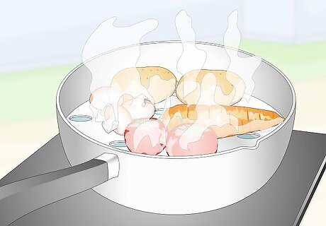 Steam your veggies and fish to keep all their nutrients intact. You can place a steaming basket over a pot of boiling water or you could also wrap your ingredients in foil and place them in the steamer basket to contain all the juices. Simply bring a pot of water to a boil, place your steam basket on top, and add your ingredients to the basket. The best ingredients to steam are veggies like green beans, zucchini, and asparagus. Fish fillets and shellfish also steam well. In general, the veggies and meats that take the least amount of time to cook are the best ones to steam. Veggies generally take about 15-20 minutes to steam, whereas fish will take only about 6-15 minutes, depending on how thick the fillet is. Check online for specific steaming times. Add a pinch of salt or some lemon juice to your steamed veggies or fish for some extra flavor.