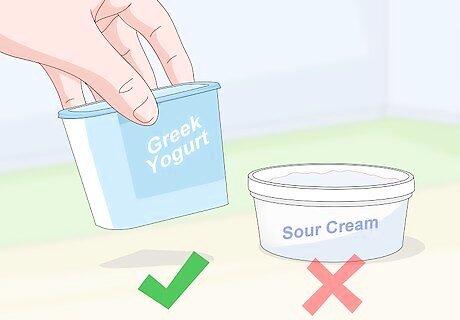 Use Greek yogurt instead of sour cream for a heart-healthy substitute. Purchase plain Greek yogurt and use it in place of sour cream, whether you are using it as a component of an actual recipe or just as a topping to a dish, like baked potatoes or tacos. Greek yogurt has fewer calories and grams of fat than sour cream, and the texture and taste are very similar!