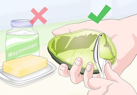 Smash up an avocado to use in place of mayonnaise or cheese. If you’re looking for a creamy alternative when making sandwiches, wraps, or tuna salad, try cutting open an avocado and mashing the fruit to use lieu of mayo or cheese. Avocado has a similar texture to mayonnaise, and while avocado is still high in fat, it has tons of other vitamins, minerals, and fiber.