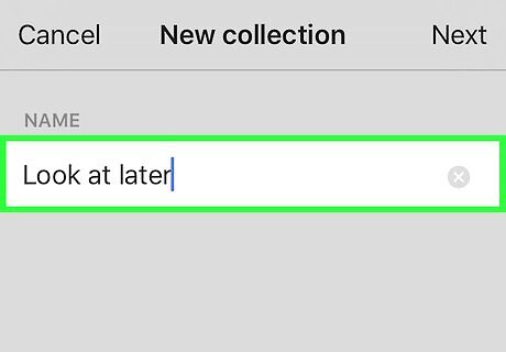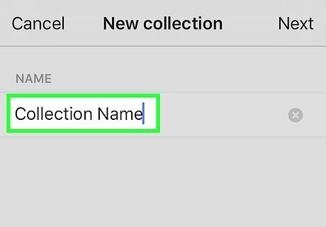 Name your Collection and hit the "Next" button. You'll have the option to name each collection when you create one. Think of a name that represents the types of pictures you want to add to the collection and tap "Next." For example, if you are trying to collect all the images of your pet cat, you may want to name the collection "Cat" or "Kitty."