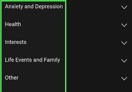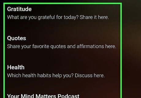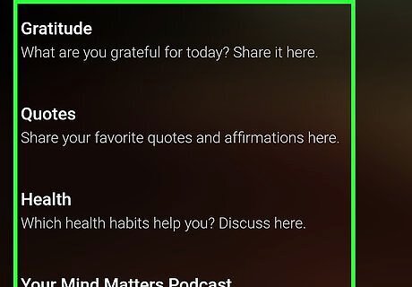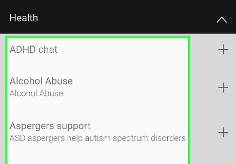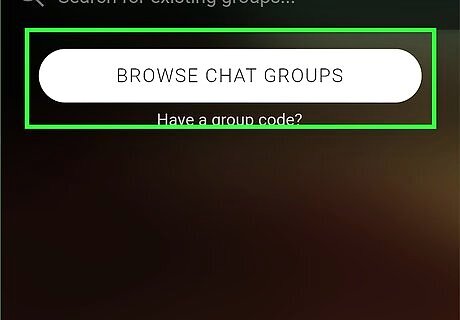 Tap Browse Chat Groups. It's the white button at the top of the screen. This displays a list of categories, such as Anxiety and Depression, Health, Interests, Work, School, and more.