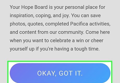 Tap Okay, Got it. When you first open the Hope Board, a message displays explaining that the Hope Board is where you can save photos, quotes, and completed activities. Read the card and tap Okay, Got it.