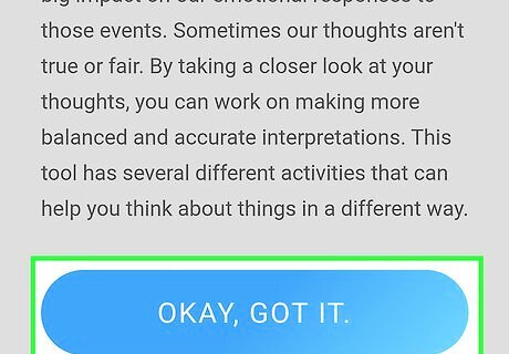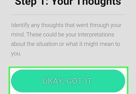 Tap Okay, Got it. When you first open the "Thoughts" tool, a message displays explaining that the Thoughts tool is designed to help you examine your thoughts more closely and make better interpretations. Read the message card and tap Okay, Got it.