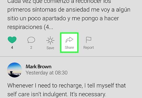 Tap a category. There are a variety of categories under the community board. These include Gratitude, Health, Quotes, Relax, Goals, and more. This displays all the messages under that category. The first time you open a category of the Community Board, you'll be prompted to read through the community rules. Read and swipe through each page to proceed.