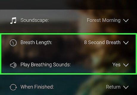 Select other meditation options. Different meditation exercises may have different options. Breathing meditations include the option to select your breath length (8 seconds, by default) as well as the option to play breathing sounds during the meditation. Positive thinking meditations include the option to select an affirmation or record your own.