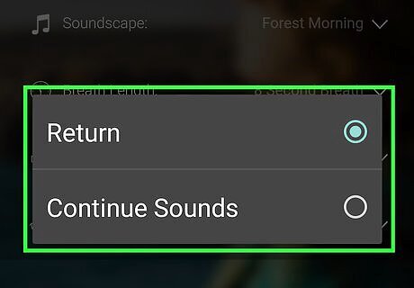 Select what to do when finished. All meditations have the option to select what to do when finished. By default, it will return to the meditation title screen. To continue sounds, tap When Finished and select Continue Sounds