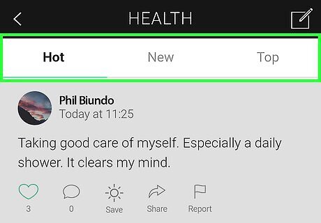 Sort the post order. You can filter the posts in any category by tapping one of the following filters at the top: Hot: filters the posts that are currently receiving a lot of attention. New: sorts the newest posts at the top. Top: sorts the most popular posts of all time.