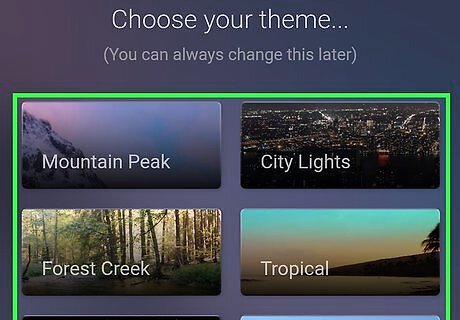 Choose a theme and tap Next. There are eight relaxing themes to choose from. You can choose Mountain Peak, City Lights, Forest Creek, Tropical, Over Earth, Ocean Blue, Night Sky, or Ocean Sunset. Tap the image you wish and tap Next. You can change the theme later on in the settings menu.