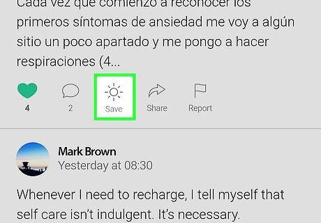 Tap the sun icon to save a post. This asks you if you want to add the comment to your Hope Board. Tap Save to post the comment to your Hope Board.