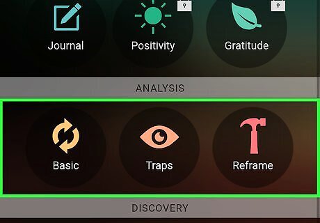 Tap a Thoughts analysis. There are three thought analyses available with a free account: Basic: This is a simple thought record that will help you see the relationship between your thoughts, experiences, and emotions. Traps: This tool helps you identify troublesome thoughts that keep getting you stuck. Reframe: This tool helps you identify thought traps and reframe your way of thinking to something more positive.