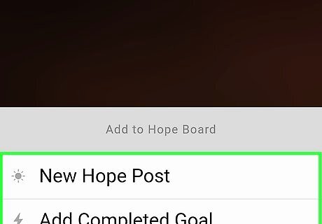 Tap New Hope Post or Add Completed Goal. There are two types of posts you can add to the Hope Board. Your options are as follows. New Hope Post: Under New Hope Post, tap Add Photo to take a photo, or pick one from your library. Write a message in the box that says "Add some text or a quote". When you are finished, tap Submit to add your post to the Hope Board. Add Completed Goal: Under Add Completed Goal, use the drop-down menu to select a completed goal and tap Add to Hope Board.