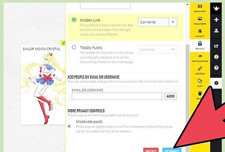 Click on the Privacy tab to choose whether you wall will be private, hidden, password protected or public. Padlet describes these options to you underneath each radio button. Click “Submit” to save these settings.