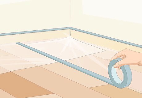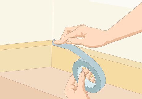 Protect floors and ceilings by taping plastic or kraft paper to them. If you are painting a large room and are worried about your floors or ceilings getting splattered by paint, you can use painters tape to tape down plastic sheets or kraft paper that will protect the areas you don’t want to paint. Use your painters tape to stick down the corners of your plastic or paper and cover the entire floor or ceiling. Pay special attention to the areas most near the walls, because these are most likely to get accidental paint splatters on them. You can buy plastic sheets and kraft paper at most home improvement and hardware stores. You can also use newspapers to cover up your floors, but these are not as thick as kraft paper and aren’t made specifically for catching paint, so they might not work as well.