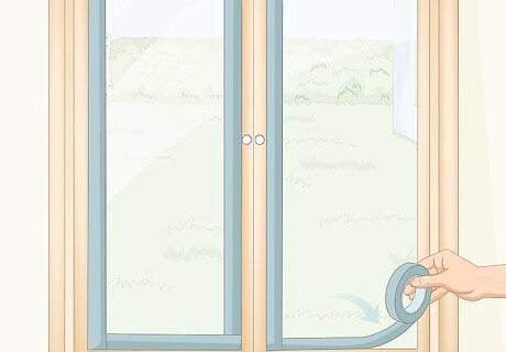 Put tape around your window panes to protect the glass from paint. You can use painters tape to cover window glass when you are adding new color to the border or panes of your window. If you want full coverage, you can cover all of the glass in your window with painters tape, but it may be more helpful to use kraft paper or a plastic sheet. If you do get paint on the glass of your window, wait for the paint to dry and then use a razor blade to gently scrape the paint off.