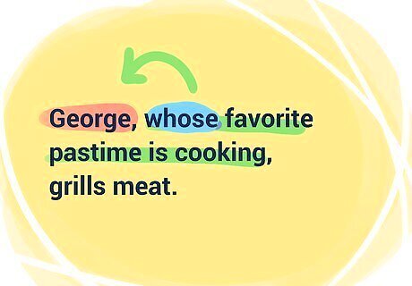 Consider using “whose” to try out a different relative pronoun. If you want to use a different relative pronoun, try “whose.” “Whose” is actually a possessive pronoun; it shows possession. Let’s look at the basic sentence again, “George grills meat.” Think of it the same way you would use “his” or hers”; those words show possession, as well. Consider this addition: “George, whose favorite pastime is cooking, grills meat.” This sentence could be divided up this way: “George grills meat; his favorite pastime is cooking.” However, when you add it as a relative clause, you use “whose” instead of “his.” In this case, “whose” is actually acting as an adjective describing the subject of the clause, “favorite pastime.” It’s possessive because it’s George’s pastime; it “belongs” to him in a sense.
