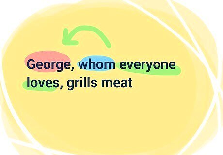 Understand that “whom” acts a bit differently than other relative pronouns. “Whom” acts a bit differently than other relative pronouns. It is an object instead of a subject. Consider this sentence: “George, whom everyone loves, grills meat.” Without the relative clause, the same information could be expressed like this: “George grills meat. Everyone loves him.” In the first sentence, look at the dependent clause, and rearrange it this way in your head: “Everyone loves whom.” While it sounds a bit silly, it makes sense if you replace “whom” with “George” (as that is what a pronoun does—it stands in for a noun, like “George”). “Everyone” is the subject, doing the action; “whom” is the object. Because “whom” is the object in the clause—who the action is being done to—you use “whom” instead of “who.”