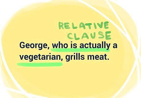 Determine which part of the simple sentence your relative clause will describe. Now, because a relative clause modifies (i.e. describes) a noun, you have two choices in this sentence for using a relative clause - "George" and "meat". Let’s modify “George.” What could you say about George that is relevant to the sentence? What if George is a vegetarian? That would be relevant information for the reader to have. Add the relative clause after George because you are describing him, for example: “George, who is actually a vegetarian, grills meat.” This clause describes George—it is giving the reader extra information about him. Therefore, it is functioning as an adjective, as adjectives describe nouns. It is set off by commas because the information isn't essential to the sentence.