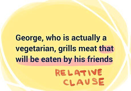 Try using your relative clause to describe a different part of the simple sentence. However, the sentence given above is not your only option for adding a relative clause to the sentence. “Meat” can also be modified. However, because “meat” is a thing, you’ll use “that” or “which” instead of who. For example: “George, who is actually a vegetarian, grills meat that will be eaten by his friends.” In this case, you do not use a comma after the word "Meat" because the clause changes the meaning of the sentence, so the information is considered essential. If the sentence was “George, who is actually a vegetarian, grills meat, which isn’t vegetarian,” a comma is used before the word “which”. This is due to the fact that the information given in the relative clause is obvious and doesn't change the meaning of the sentence.