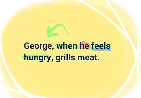 Try modifying the subject of your sentence with an adverb. When writing a relative clause with a relative adverb, you’ll need a subject and a verb, as the relative adjective does not act as the subject of the clause. Let’s begin with the same simple sentence: “George grills meat.” Once again, you have two nouns you can modify, “George” or “meat.” Let’s try describing “George.” For instance, you could describe George by including information on when he grills meat: “George, when he feels hungry, grills meat.” The clause “when he feels hungry” is modifying George. In this clause, “he” is the subject, while “feels” is the verb.