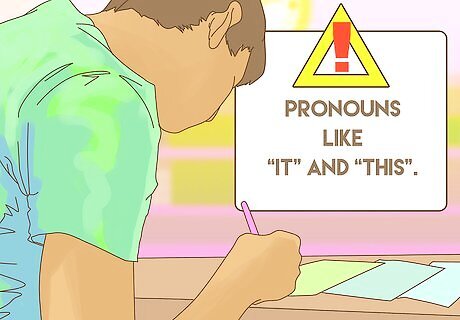 Be careful of pronouns. Pronouns like “it” and “this” can end up confusing readers as most statements you write will refer to multiple nouns. A pronoun, in general, has something called an antecedent. The antecedent is the noun that pronoun is referring to. For example: My dog chased the stick and brought it back. The word ‘stick’ is the noun, and ‘it’ is the pronoun. The pronoun ‘it’ is referring to the antecedent ‘sticks.’ Ideally, you should repeat the noun when possible (e.g. my dog chased the stick and brought the stick back), or reword the sentence such that pronoun is not required (e.g. my dog chased and brought back the stick). An example of a statement where pronouns are used: “The monitor needs to be plugged into the computer, it should be close enough for a cable to reach.” What is “it” referring to? The monitor or the computer? An example where pronouns are not used: “The monitor needs to be close enough to the computer so the cable can reach."