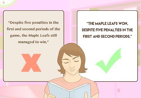 Put the key information up front. When making a point in technical writing, put the most important pieces of information first. Once the key information has been stated, then you can follow-up with an explanation of why it happened, or what caused it to happen. Don’t say “Despite five penalties in the first and second periods of the game, the Maple Leafs still managed to win,” when you can say “The Maple Leafs won, despite five penalties in the first and second periods."