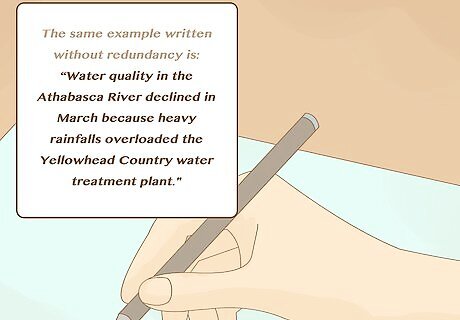 Remember that less is more. When trying to explain something technical to the average person, use as few words as possible to get your point across. It is not necessary to explain every last thing you say in immense detail. Remember who your audience is - if you’re writing a user’s manual for a DVD player, you don’t need to explain how the circuit boards inside the DVD player work. You just need to explain what happens when you press a certain button. This suggestion also includes choosing the least number of words necessary to make a point - avoid redundancy. An example of a redundant statement is: “Water quality in the Athabasca River declined in May. This decline occurred because of the heavy rainfall this month. All the extra water overloaded Yellowhead county’s water treatment plant.” The same example written without redundancy is: “Water quality in the Athabasca River declined in March because heavy rainfalls overloaded the Yellowhead Country water treatment plant." Example statements (with needless words in parentheses) are as follows: (already) existing at (the) present (time) (continue to) remain (empty) space mix (together) never (before) start (out) none (at all)