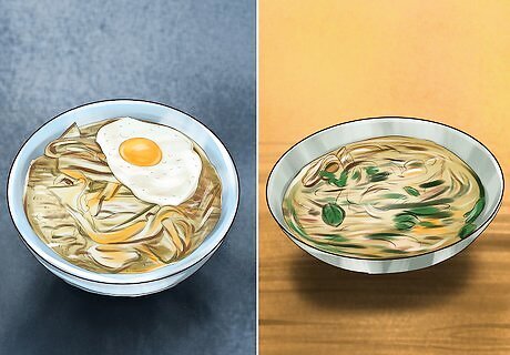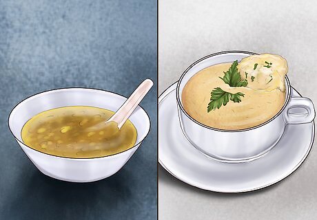 Begin lunch and dinner with soup. Starting lunch and dinner with soup can help prevent you from overeating during the meal. Soup helps provide you with nutrients, like protein and fiber, that help fill you up. The broth in the soup can help fill you up before you eat so you don’t eat too much. Try egg drop or black bean soup as an appetizer, for example.