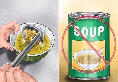 Limit canned soups. Eating canned soups too frequently can be unhealthy. Canned soups are full of unnecessary salts and may contain additives, chemicals, and preservatives that are unhealthy. Look for low-sodium canned soups or make your own. An easy recipe is just combining no sodium broth, vegetables, and a lean meat. You can put low-fat steak or chicken breast in no sodium added vegetable broth, then add carrots, kale, and black beans for a quick, easy soup. You can also make pureed vegetable soup. Start by cooking the vegetable in broth until it is soft and cooked. Then puree it into a soup. Try making puree soup with carrots, beets, spinach, kale, broccoli, or butternut squash.