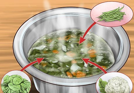 Add fiber-filled foods. Soups can help you not to overeat by helping you fill up on fiber. Fiber keeps you full without adding excessive calories. Adding a variety of vegetables and beans to your soup can provide your needed fiber content. All vegetables contain fiber, but you may want to include greens, like kale or spinach, carrots, beans, broccoli, cauliflower, squash, or asparagus.