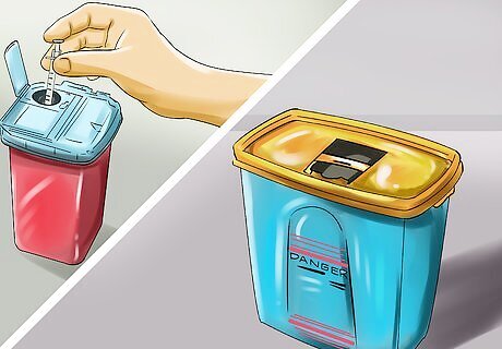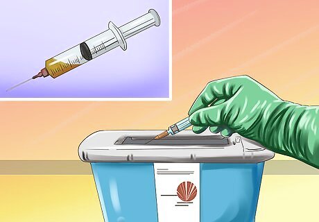Dispose of the needle and dirty supplies. Once you have injected the vaccine, you will need to pull out the needle and dispose of it properly. A used needle should be put in a sharp instruments container. This is used so that the needle doesn't accidentally prick anyone. Any supplies that have blood or body fluids on them should also be disposed of properly, ideally in a biohazard container. Biohazard containers and sharp instrument containers are available online or through you local medical supply company. To find out where you can dispose of your sharp instruments container when it is full, contact your local waste disposal agency.