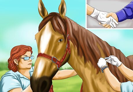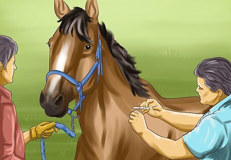 Discuss vaccinations with a veterinarian. A veterinarian should have a good understanding of what diseases are common in horses in your area, whether the horse's health history and vaccination history should impact its vaccinations, and how much and when vaccines should be given in order to prevent common diseases. This discussion can occur over the phone or over email if your horse does not need a veterinary exam. You can also just make an appointment for the veterinarian to give your horse its vaccinations. However, this will cost you more money than doing it yourself.