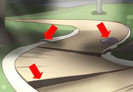 Look out for tripping hazards. You might encounter any number of obstacles on your walking path. While these are easy to see in daylight, they become more difficult to see at night. Keep your eyes focused on the path in front of you to avoid injuring yourself due to a nasty spill. Some of the most obvious hazards you might encounter include: roots rocks uneven sidewalks potholes bikes laying on the sidewalk trash bags or containers