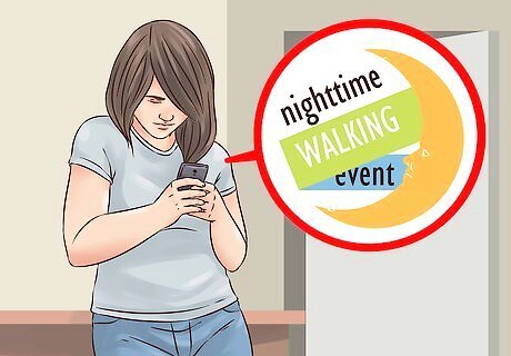 Find a nighttime walking event. Many major organizations and nonprofits sponsor night walks for a variety of important causes. For instance, you might be able to find nighttime walking events to support leukemia, lymphoma, and other cancers. Check your community’s local events calendar online or browse your local newspaper’s event listings for information about nighttime walking events near you.