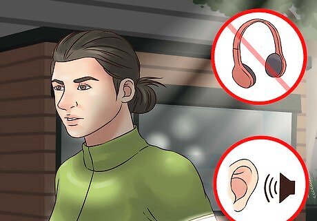 Listen to your surroundings. Even though you’re walking at night, there are many sounds that you should listen for to stay safe. Cars might honk if you step into the road carelessly. Runners might warn you they’re coming up behind you. Hearing these audio cues can keep you and others safe, so listen up when walking – day or night. Listen for animals, especially when walking in a rural area. Avoid using headphones. If you really want to listen to something, put only one earbud in and keep the volume low. Try bringing some emergency equipment along with you like a whistle, pepper spray, phone, and flashlight or flashlight app.