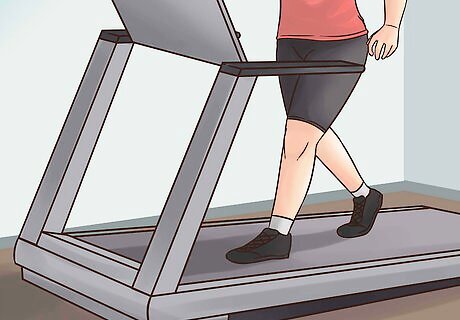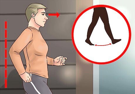 Assume the proper walking form. Walking for fitness requires you to keep your head up, back straight, and eyes forward. Keep your arms relaxed at your sides. You can pump them a little, but don’t clench them too close to your body. Tighten your stomach slightly but keep your neck and shoulders relaxed. Don’t lift your feet like a marching soldier. Instead, roll your foot off the ground from the heel to the toes.