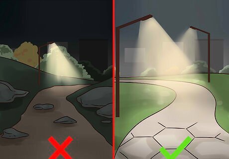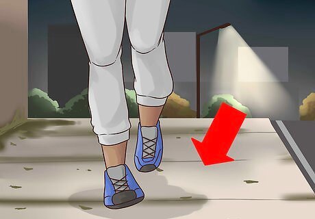 Stick to a well-lit path. You’ll have a much better time walking if you can see where you’re going. If your path is poorly lit, you might step on sharp objects or broken glass. You might stumble on rocks or an uneven sidewalk. Walking in areas that have streetlights also makes it easier for other people to see if you need help. Look for paths that are not only well-lit, but have regular lighting. In other words, try not to trace a path that leads from a brightly lit street with many open businesses and lots of vehicular traffic to a street that has only a few street lights. It takes your eyes time to adjust to these different levels of lighting.