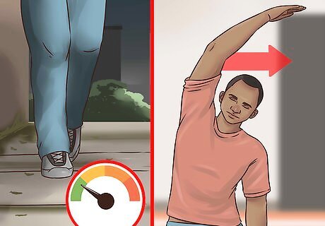 Slow your pace as you near your destination. Once you get close to the end of your walking route, slow your pace slightly. Walk slowly for the last five minutes of your walk. This will help your muscles relax and provide a brief cooldown period. Once you arrive at home, do a few simple stretches. For instance, rotate your neck and tilt your head from side to side. Bend down and try to touch your toes. Put your right arm over your head and tilt your body to the left. Hold the pose for 20 seconds, then repeat on the opposite side.