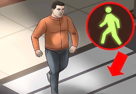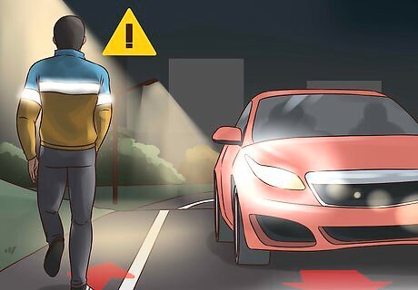 Use caution near vehicles. If you’re struck by an automobile while on foot, you could be seriously injured. Therefore, it’s important to limit your risk for auto accidents while walking for exercise at night. Important steps you can take to limit your likelihood of being hurt include: Walk against traffic if you’re walking in the road. In other words, walk on the side of the street where cars are headed toward you. This will allow you to better see and react to vehicles. Always look both ways before crossing the street. Stop and look up both ways before stepping onto a roadway. Even if you have the walk signal, look both ways. Many drivers barrel through red lights.